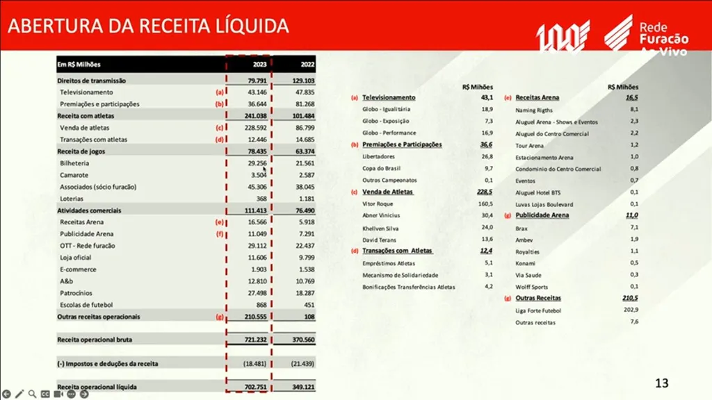Por outro lado, houve um grande crescimento na receita com a venda de atletas, puxado principalmente pela transferência do atacante Vitor Roque para o Barcelona. O total da receita foi de R$ 241 milhões.