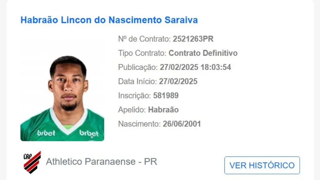 O zagueiro Habraão é a nova contratação do Athletico para 2025. O jogador de 23 anos pertencia ao Fortaleza e teve nome publicado nesta quinta-feira (27) no Boletim Informativo Diário (BID) da Confederação Brasileira de Futebol (CBF).