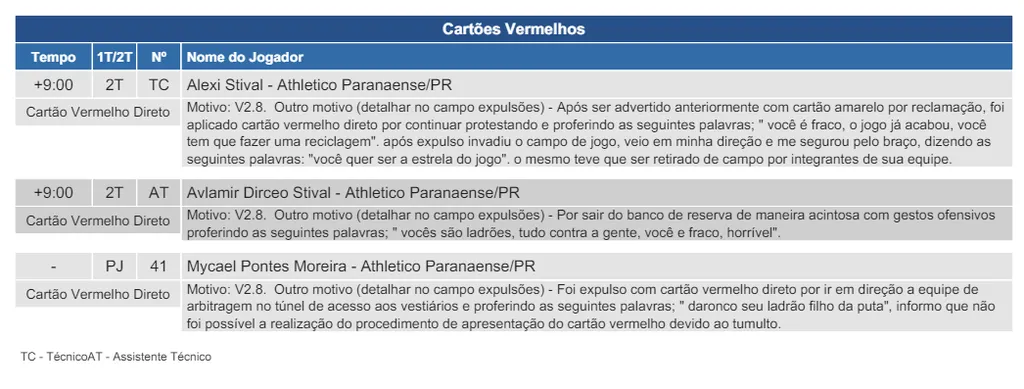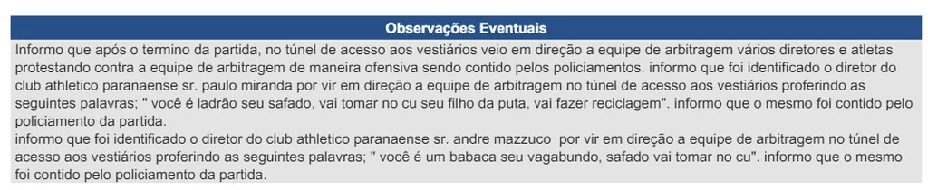 Já o diretor executivo do Athletico, André Mazzuco, também foi denunciado na súmula por ter “Você é um babaca, seu vagabundo. Safado, vai tomar no…”, disse. Após a partida, Mazzuco fez um pronunciamento e disparou mais críticas ao juiz e também pela escolha da CBF.