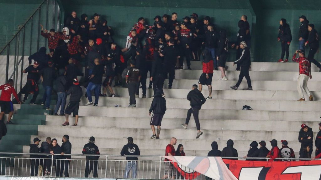 Na reta final da partida, torcedores do Athletico começaram a brigar entre si, trocando socos e pontapés. A confusão durou minutos, mesmo com a bola rolando, e só terminou com a chegada da Polícia Militar (PM) no local. Ninguém foi detido.
