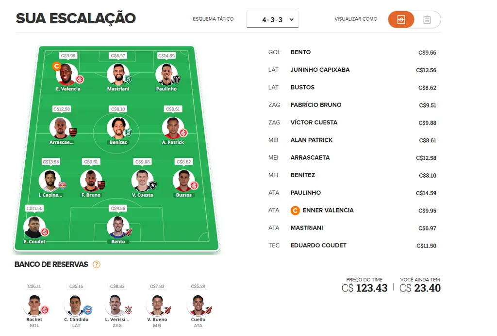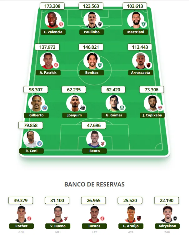 Banco de reservas: Rochet (Internacional), Camilo Cândido (Bahia), Lucas Veríssimo (Corinthians), Vitor Bueno (Athletico) e Cuello (Athletico). Lembrando que escalar o banco de reservas não é obrigatório.