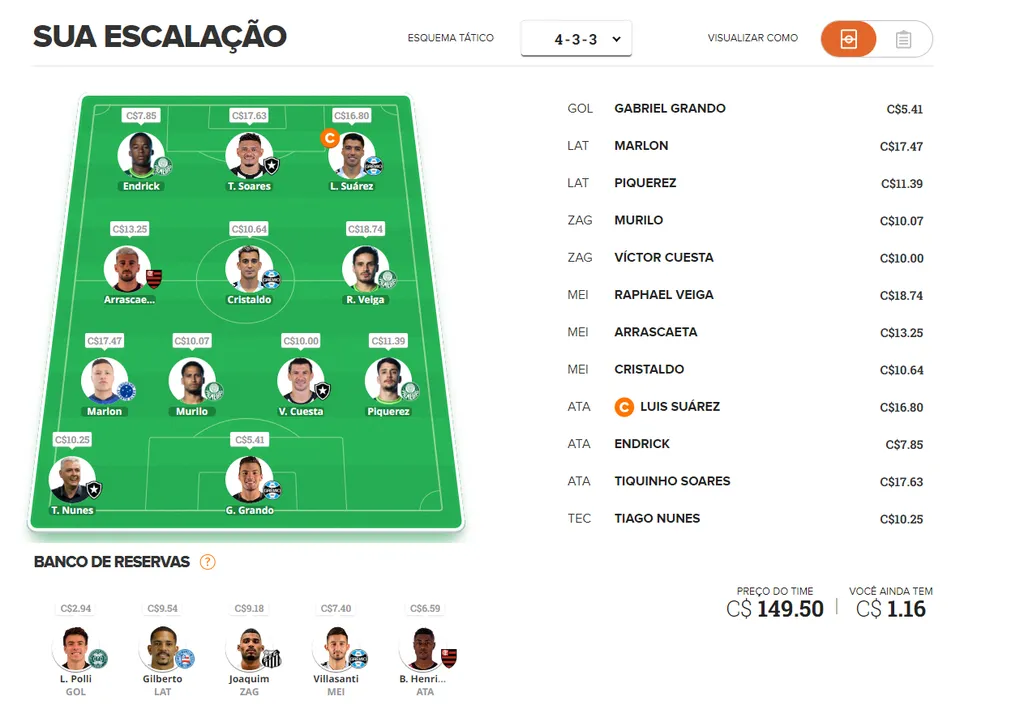 Suárez, atacante (Grêmio): Em tom de despedida do Tricolor, o atacante vai querer terminar o campeonato da melhor forma. O time gaúcho encara em Goiás quase sem esperança de permanência dentro da Arena. O uruguaio tem média de mais de nove pontos no Cartola. Será nosso capitão.