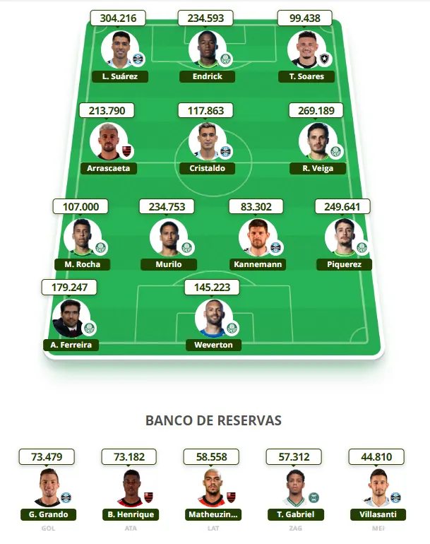 Escalação: Gabriel Grando (Grêmio); Marlon (Cruzeiro), Murilo (Palmeiras), Cuesta (Botafogo) e Piquerez (Palmeiras); Arrascaeta (Flamengo), Raphael Veiga (Palmeiras) e Cristaldo (Grêmio); Endrick (Palmeiras), Tiquinho Soares (Botafogo) e Suárez (Grêmio). Técnico: Tiago Nunes (Botafogo). Valor do time: C$ 149,50.