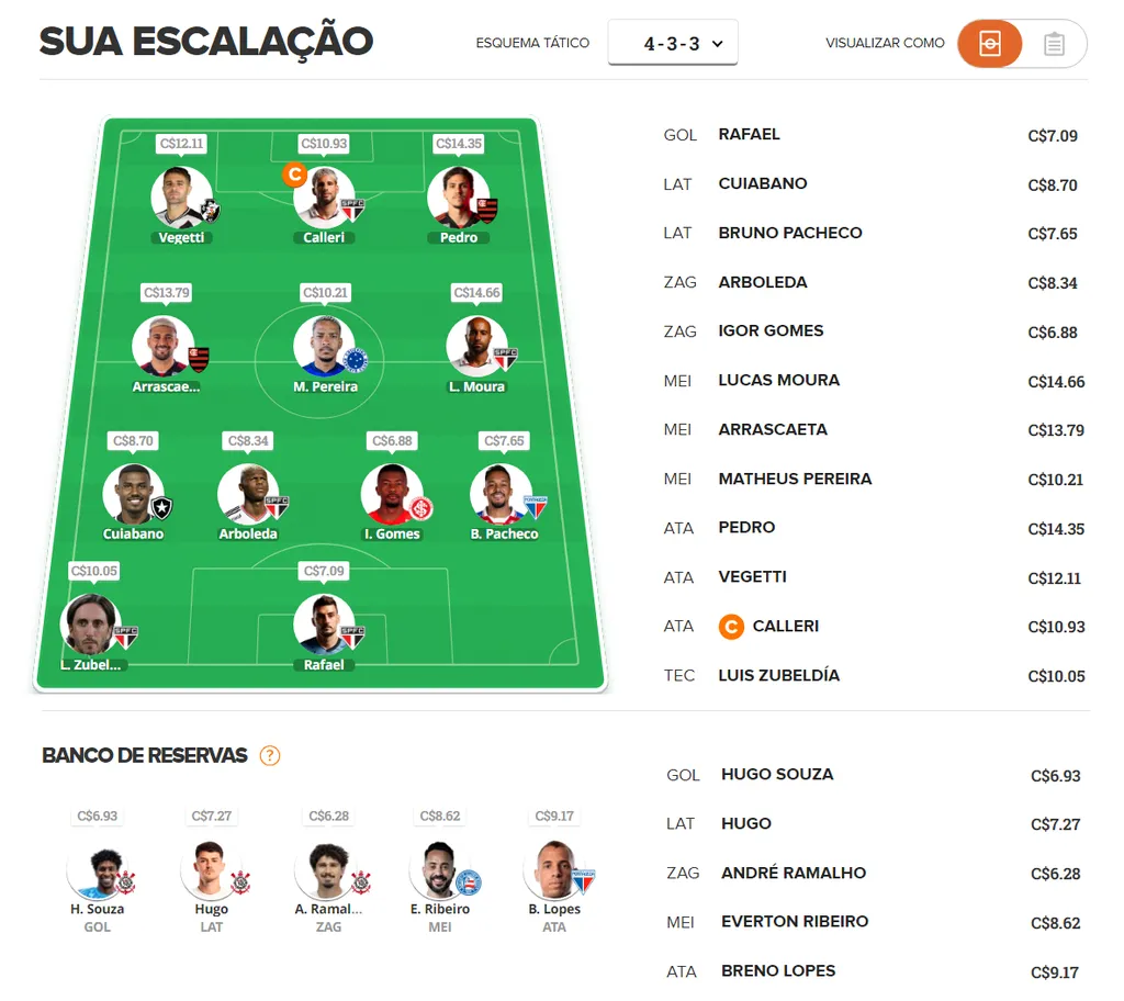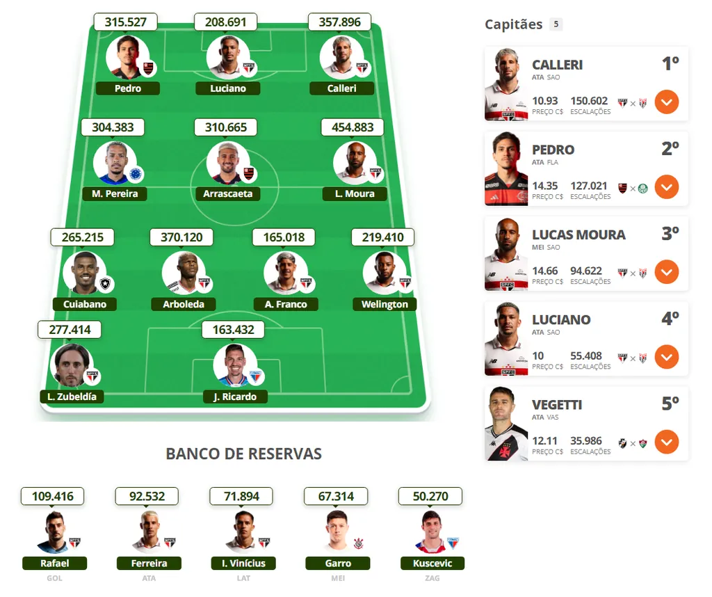 No Cartola, os cartoleiros estão apostando mais em jogadores do São Paulo. Isso porque o Tricolor enfrenta o lanterna Atlético-GO no Morumbi. Calleri e Lucas Moura são nomes unânimes para se ter no time nesta 22ª rodada.