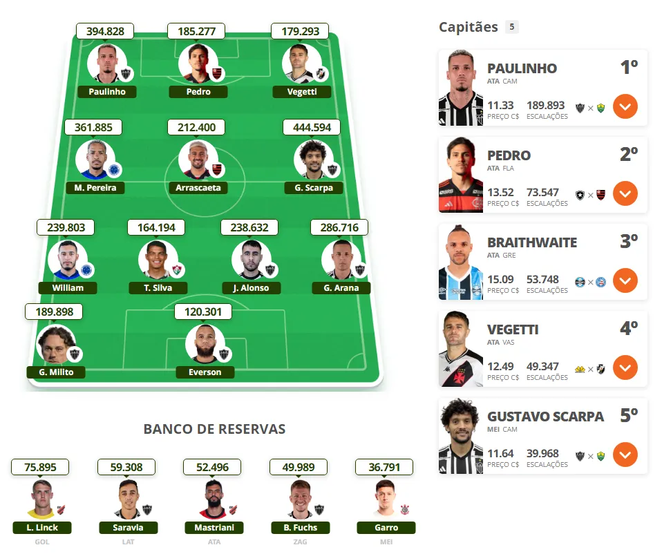 Veja o time e os capitães mais escalados da 23ª rodada: