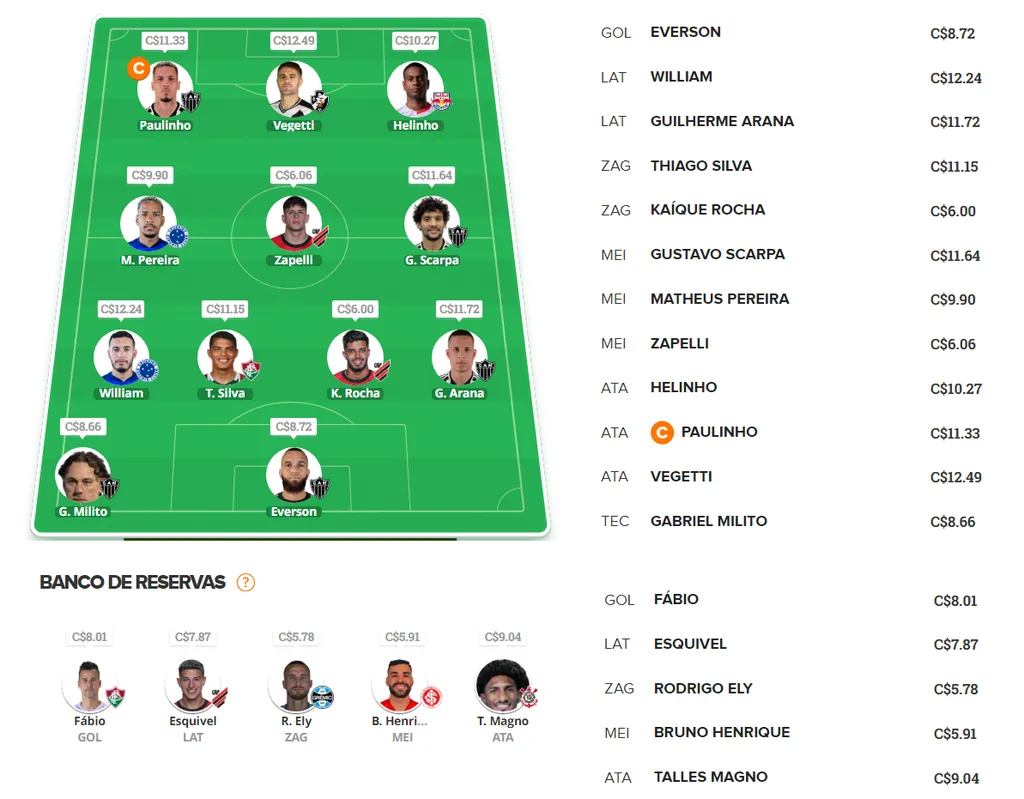 A verdade é que é uma rodada um pouco complicada para escalar. Outros clubes também podem poupar. Por isso, a dica é montar um time bem variado. O Cruzeiro, por exemplo, tem bons nomes como William e Matheus Pereira. A Raposa pega o Vitória fora de casa.