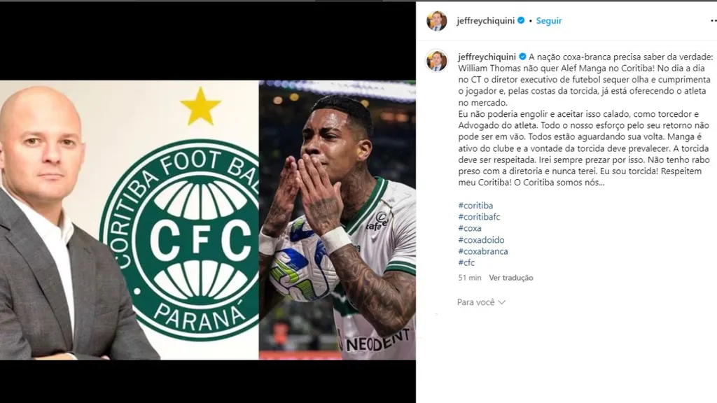 Eu não poderia engolir e aceitar isso calado, como torcedor e Advogado do atleta. Todo o nosso esforço pelo seu retorno não pode ser em vão. Todos estão aguardando sua volta. Manga é ativo do clube e a vontade da torcida deve prevalecer. A torcida deve ser respeitada. Irei sempre prezar por isso. Não tenho rabo preso com a diretoria e nunca terei. Eu sou torcida! Respeitem meu Coritiba! O Coritiba somos nós…”, escreveu Jefrrey Chiquini nas redes sociais.