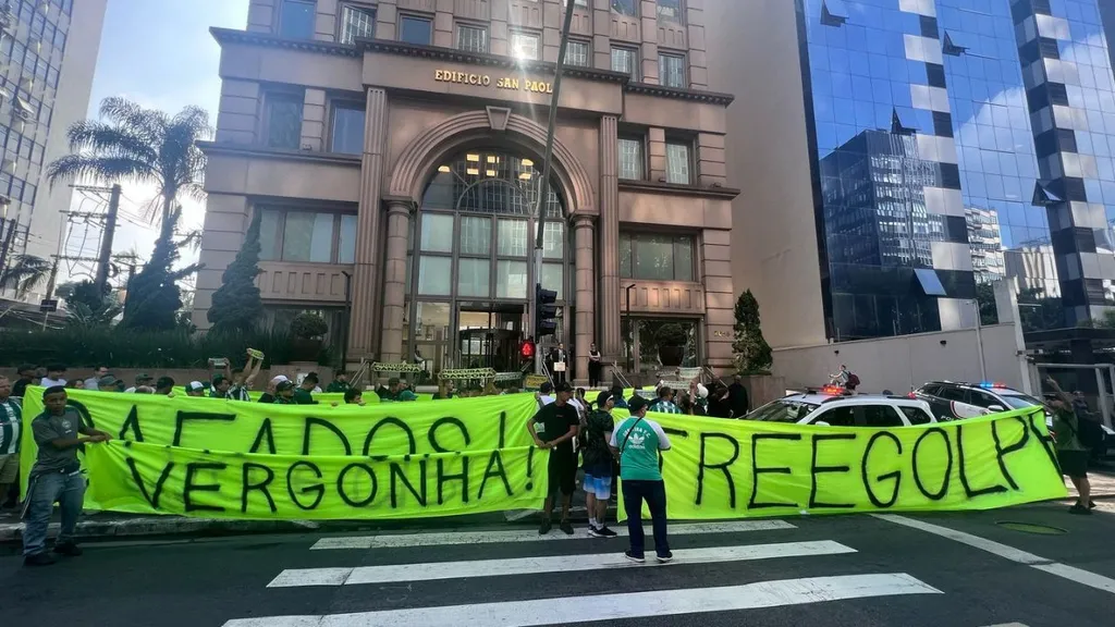 Nesta terça-feira (25), dois ônibus de torcedores do Coritiba desembarcaram em São Paulo para protestar em frente à sede da Treecorp, na Avenida Brigadeiro Faria Lima.