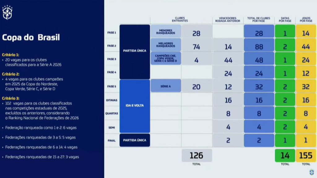 A Copa do Brasil muda radicalmente a partir de 2026. Com 126 times, a competição nacional terá cinco fases em jogo único e todos os times da Série A do Campeonato Brasileiro entram apenas na quinta fase, a última antes das oitavas de final.