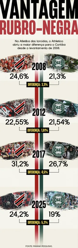 O resultado da nova pesquisa de torcidas em Curitiba indica distância recorde entre as torcidas de Athletico e Coritiba desde a primeira verificação do Paraná Pesquisas, em 2008. Na época, o time da Baixada liderava com apenas 3,3% de vantagem.