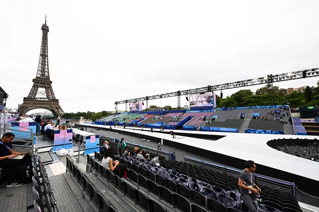 No final do trajeto, no Trocadero, em frente à Torre Eiffel, os atletas chegavam em menor número, sugerindo que parte das delegações estava sendo poupada. Nas tribunas, sem a mesma opção, autoridades, público e jornalistas sofriam sob muita água. Apenas o trecho onde estava o presidente Emmanuel Macron era mais protegido.